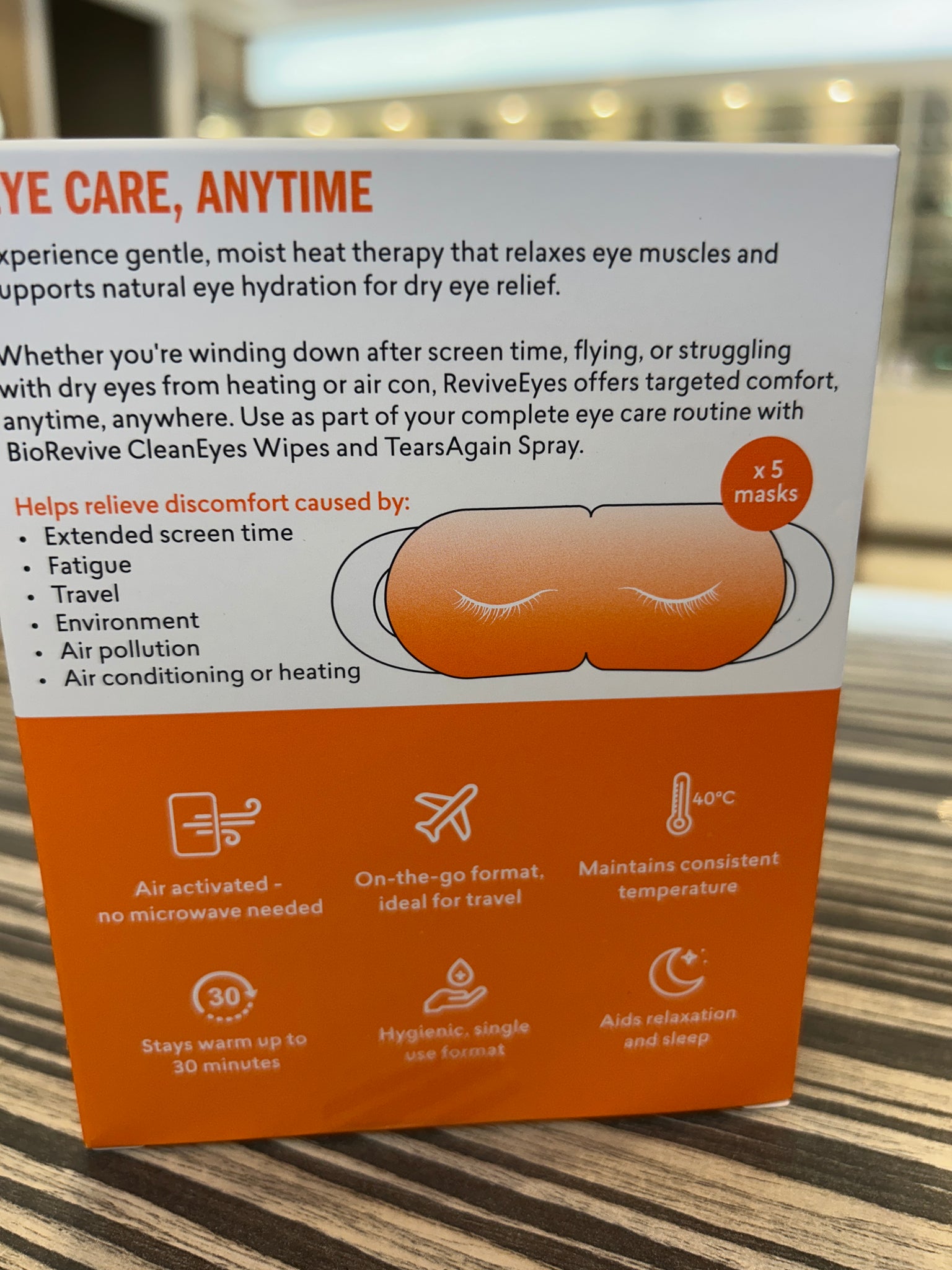 Each individually wrapped mask is air-activated and self-heats to a consistent, gentle temperature – no microwave needed! This also makes the EyeRevie Mask ideal for travel.